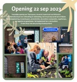 Feestelijke opening van Thymsquare, de eerste Superstraat van Rotterdam. Een sfeervolle straat voor ontmoeting en uitwisseling. Een straat waar je wil zijn en blijven. Met bewegwijzering, lampenkappen, picknicktafels, decoratieve raampanelen, vogelhuisjes, een regenton en geveltuinen. Het keukenkruid tijm in de hoofdrol. En een straat met een prachtig straatnaambord.